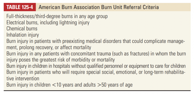 Guidelines for transfer to burn center are summarized in the following table and include circumferential extremity burns, inhalation injuries, and burns involving the hands. Other important things to remember are management of airway, fluid resuscitation, early analgesia for pain, and updating tetanus status.