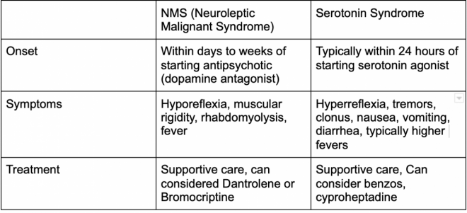 Answer: B. Haldol. This patient is presenting with signs/symptoms of neuroleptic malignant syndrome (NMS) which is a reaction to antipsychotic agents. It is characterized by altered mental status, autonomic dysfunction, fever, and muscle rigidity. These patients can have seizures and ventricular dysrhythmias. Treatment is largely supportive and includes stopping the causative agent. Examples of supportive care include using cooling blankets to lower temperature, giving medications like clonidine to control blood pressures, and using benzos to control agitation. Dantrolene and bromocriptine can be considered agents to use in severe cases. Ways to distinguish from serotonin syndrome (answer A), include absence of clonus and hyporeflexia. Patients with serotonin syndrome more frequently will have shivering, nausea, vomiting, diarrhea, and ataxia as well.