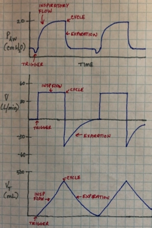 Patient-ventilator asynchrony (PVA) occurs when there is a mismatch between the patient’s respiratory system and the ventilator regarding breath size (volume), duration, flow rate, or applied pressure. Asynchrony is often referred to as a “patient bucking the ventilator,” however, it should be actually be described as the “ventilator bucking the patient” as the onus of synchronization lies on the clinician matching the ventilator with the patient’s efforts, not the other way around. PVA is underrecognized yet associated with increased mortality, ICU length of stay and duration of mechanical ventilation in critical illness. Asynchrony between the patient and the ventilator can occur during each stage of the mechanical breath and can be readily diagnosed by examination of the ventilator waveforms. The respiratory cycle of a mechanical breath can be divided into 4 distinct stages: 1) initiation of inspiration (triggering), 2) gas delivery or inspiratory flow (target), 3) termination of inspiration (cycling), and 4) expiration. The stages of the mechanical breath can be visualized on the pressure, flow and volume scalars (figure A).