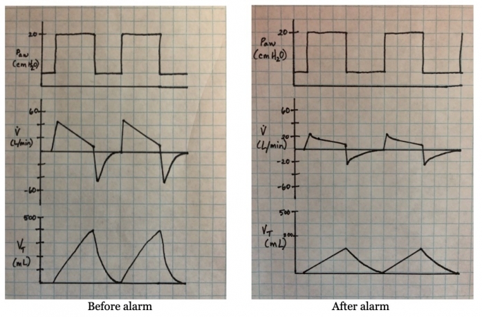 The mode is pressure control as each breath is time-triggered, pressure targeted and time cycled. You can see that each breath is delivered at a constant pressure of 20 cm H20 with a constant inspiratory time. In a pressure control breath, the tidal volume will vary with changes in lung or chest wall compliance, variation in patient effort, changes in endotracheal tube or tracheobronchial tree resistance or development of a cuff leak. In this case, the tidal volume suddenly dropped from 400 mL to 200 mL. You can rule out a leak, because the expiratory limb of the volume tracing returns to zero baseline each breath. Neither of the breaths shown are patient-triggered, so variation in patient effort cannot explain the decrease in tidal volume. To determine whether the tidal volume drop is due to a reduction in compliance (e.g. pulmonary edema or pneumothorax) or an increase in resistance (e.g. mucus plug or bronchospasm), you must examine the expiratory flow wave tracing. Before the alarm fires, the patient has a rapid expiratory flow at a peak rate of over 40 L/min. After the alarm fires, you can see that the expiratory flow rate drops in half and has a slow return to baseline suggestive of a sudden increase in resistance. Furthermore, the inspiratory flow rate is also reduced from 40 L/min to 20 L/min, confirming a rise in resistance.