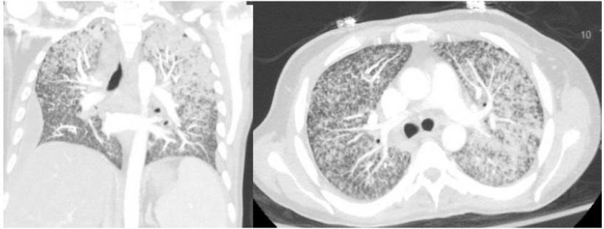 On arrival to the ED, he is febrile to 102 and hypoxic, requiring high flow oxygen therapy. Initial lab work reveals hyponatremia and transaminitis. CT head is unremarkable. A CT chest is shown as well as MRI brain. What's the diagnosis? Scroll down for answer.
