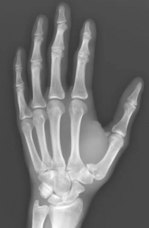 - Most commonly occurs in young males from forceful axial load against a fixed object (sports, bicycle accident, punching), presents with pain and swelling at thenar eminence, decreased range of motion at MCP/CMC joints
