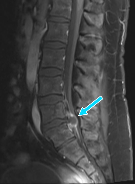1. Large peripherally enhancing left posterior paracentral structure at L5-S1 compressing