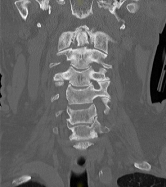 A70 yo male presents after MVC. He remembers waking up at the hospital with cervical collar in place and c/o neck pain. Denies numbness, tingling, weakness in extremities. He has midline cervical tenderness. He has full and symmetric strength in all four extremites as well as no sensory deficits. A CT cervical spine is shown (coronal). What's the diatnosis? Scroll down for answer.