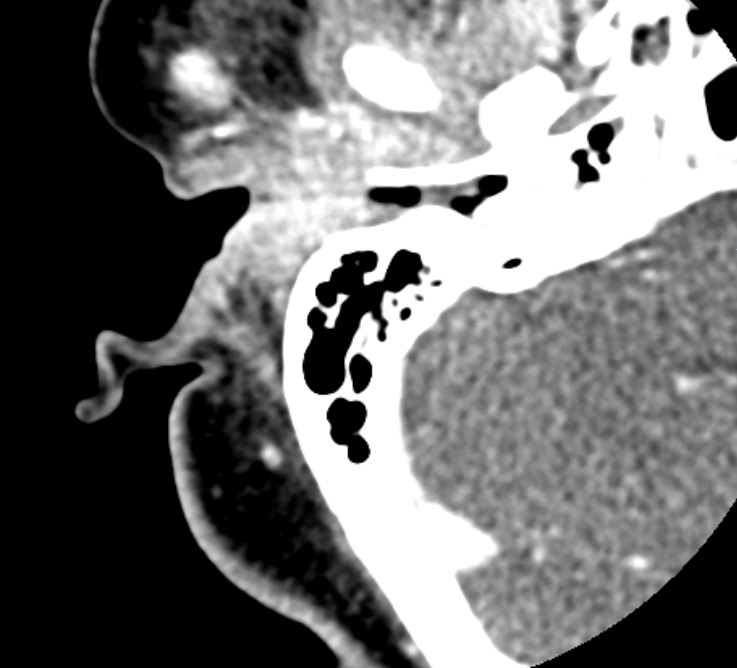 A 61 yo female with a history of DM presents with 3 days of severe R ear pain. She denies fever, but reports fullness, swelling and decreased hearing. Exam reveals significant swelling and tenderess of the R pinna and EAC without drainage. A CT is obtained. What's the diagnosis?   (scroll down for answer)