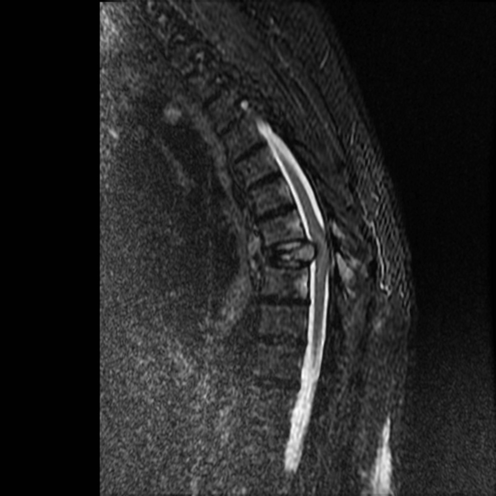 Answer: T8 pathologic fracture in this patient with plasma cell dyscrasia. MRI shows fracture with retropulsion, canal stenosis, spinal cord compression and cord edema.
